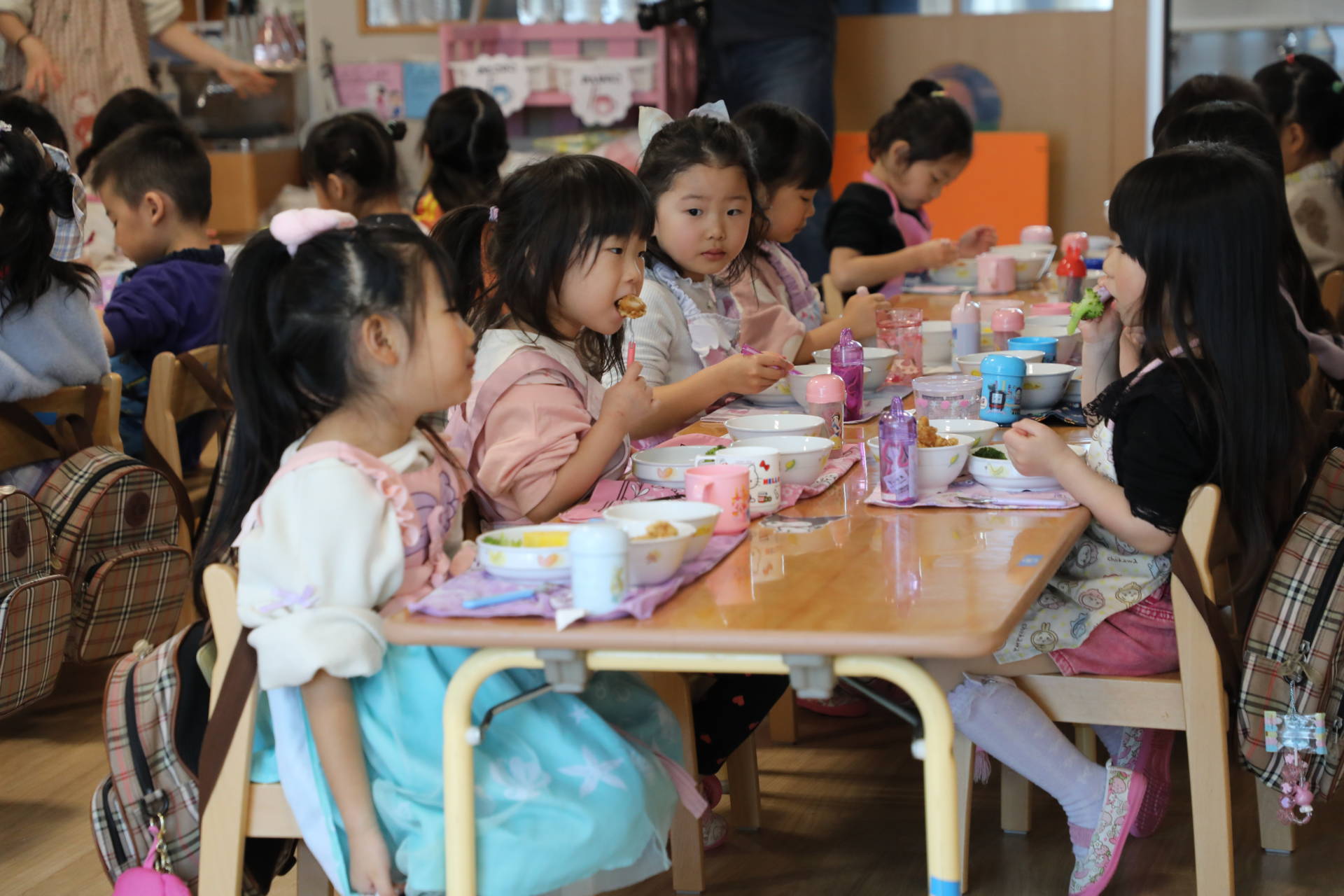 食育も含めて自園での完全調理における給食を提供しております。1、2、3号の子どもたちに合わせた量や子どもたちに好まれるメニューに配慮し、おかわりOKで人気があります。