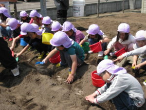 園庭にある畑においもを植え付けをしました。子どもたちは大きなたね芋を手にして畑の土を掘り一つ一つ大切においもを植える事が出来ました。いつも砂場で遊んでいる子どもたちですが、畑の土を掘る姿はいつもとは違う様相で少しづつ丁寧に掘る姿を見る事が出来ました。秋になり大きく育ったおいもを想像しながら「大きく育ってね!」とお祈りをしていました。