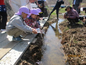 子どもたちは、慎重に沢に降りてコップに入った稚魚を受け取って、コップの中を覗き込みかわいい稚魚を眺めながら慎重に川へ放流をしていました。